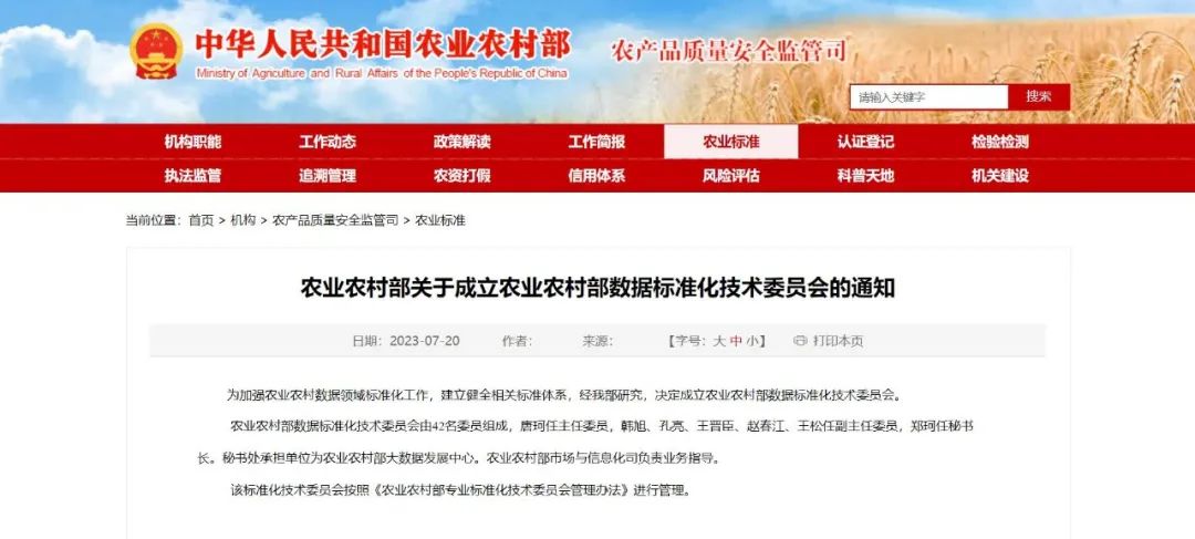 农业农村部数据标准化技术委员会由42 名委员组成,农业农村部市场与信息化司司长唐珂任主任委员,农业农村部大数据发展中心主任韩旭、农业农村部农产品质量安全中心主任孔亮、农业农村部发展规划司副司长王晋臣、北京市农林科学院信息技术研究中心研究院赵春江院士、农业农村部大数据发展中心副主任王松任副主任委员,农业农村部大数据发展中心处长郑珂任秘书长。秘书处承担单位为农业农村部大数据发展中心。农业农村部市场与信息化司负责业务指导。